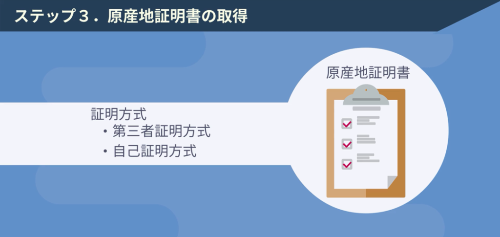 原産地規則を満たし、根拠資料が準備できたら、最後の原産地証明書取得のステップに移ります。実は、FTAによって証明書の準備方法が異なります。輸出国における発給機関から原産地証明書を発給してもらう方式(第三者証明方式)や、輸入者又は輸出者などが自ら申告書を作成する方式(自己証明方式)などが挙げられます。各EPAの証明方式についてはこちらのページをご参照下さい。