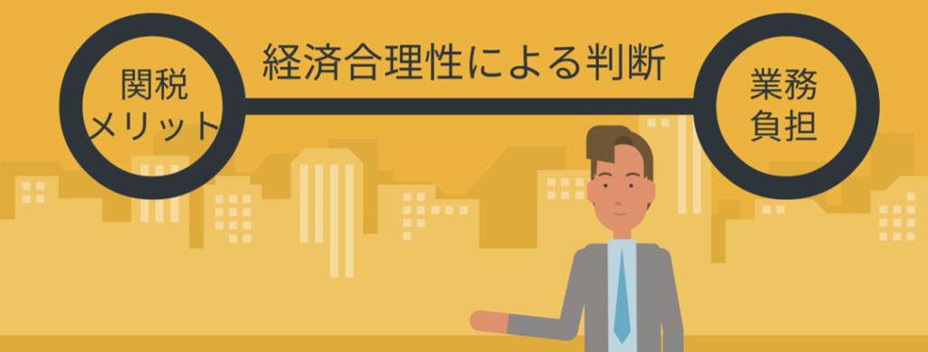 EPA/FTAを利用することで関税メリットを受けられる一方、HSコードの専門性や原産地規則への理解も必要になってくるので難易度が高いと思われたかもしれません。効率的な方法はありつつも限界があり、原産地管理を行うにはある程度の業務負荷がかかることは事実です。その業務負担と関税コストメリットを経済合理性の観点から検証し、場合によってはFTAの適用を諦めるといった判断も十分有り得ると考えています。経済合理性を適切に判断できるよう各企業様にサポートさせていただいていますので、お気軽にお声がけください。