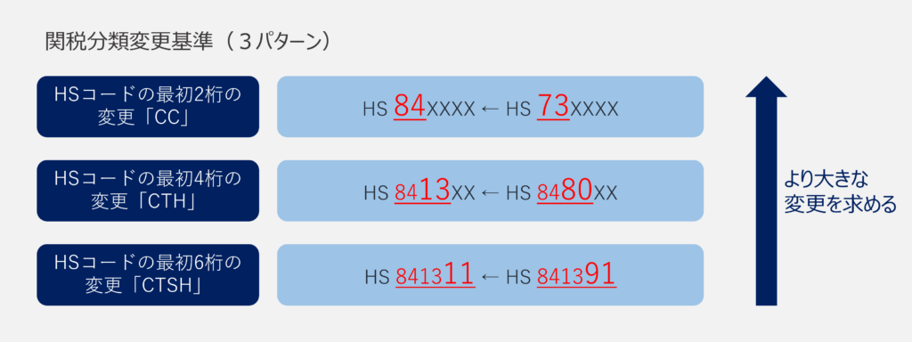 関税分類変更基準は、輸出製品のHSコードと、その製品を生産するために使用する構成材料のHSコードが一定程度変更されていれば、その輸出入製品を原産品とすることができるというものです。HSコードの最初の2桁、4桁、又は6桁のいずれかが変わっていることを求める規則で、その難易度は品目別規則によって異なります。