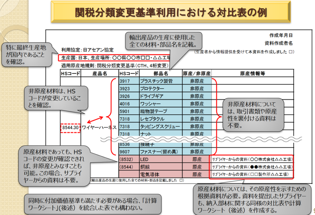 関税分類変更基準を用いた場合には、部品表(BOM)を基に、対比表を用意するようにしましょう。対比表は、生産に使用した材料のHSコードと、輸出する産品のHSコードが変更していることを示す資料で、サンプルとしては経済産業省の保存書類の例示(P9)をご参考になさると良いと思います。