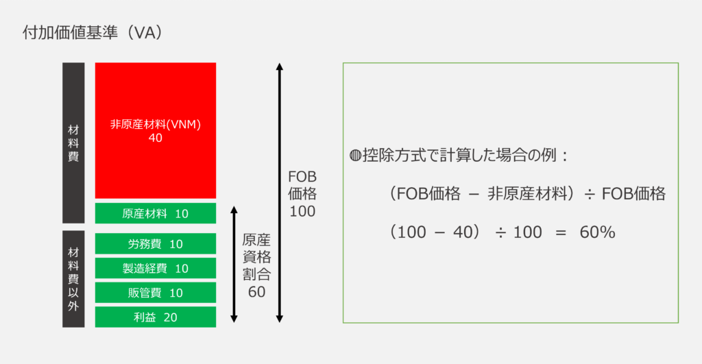 付加価値基準は、製造過程においてどの程度の価値が加えられたかという観点から、「実質的な変更」があったかを測定する基準のことです。各々のFTA/EPAで要求されている付加価値割合(RVC)を充足する場合、その製品は製造が行われた国の原産品と言うことができます。原産資格割合を算出する計算式は、製品の価格(FOB価格など)から非原産材料価格を差し引いて求める控除方式(Build down; BD)がよく用いられます。品目別規則によって求められる計算式が異なる場合がありますので、注意しましょう。