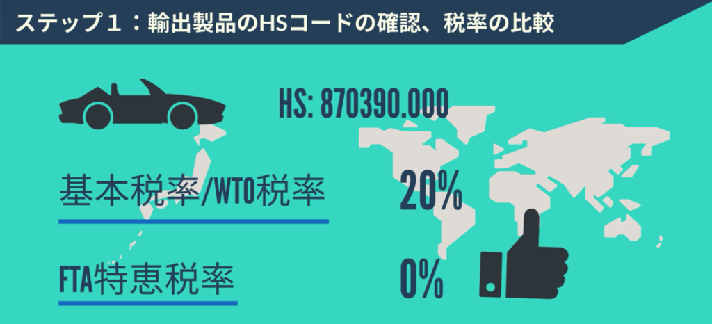 まず最初に、輸出する製品のHSコードを確認します。輸出製品のHSコードを使って、輸入国側で通常輸入する場合の関税率と、FTAを利用したときのFTA特恵税率を比較します。輸入国側で通常輸入する場合の関税率は、基本税率とWTO税率が利用されることが多いです。基本税率・WTO税率とFTA特恵税率を比較してみて、FTA特恵税率の方が低い税率で、関税上のメリットが確かに得られることを確認しましょう。